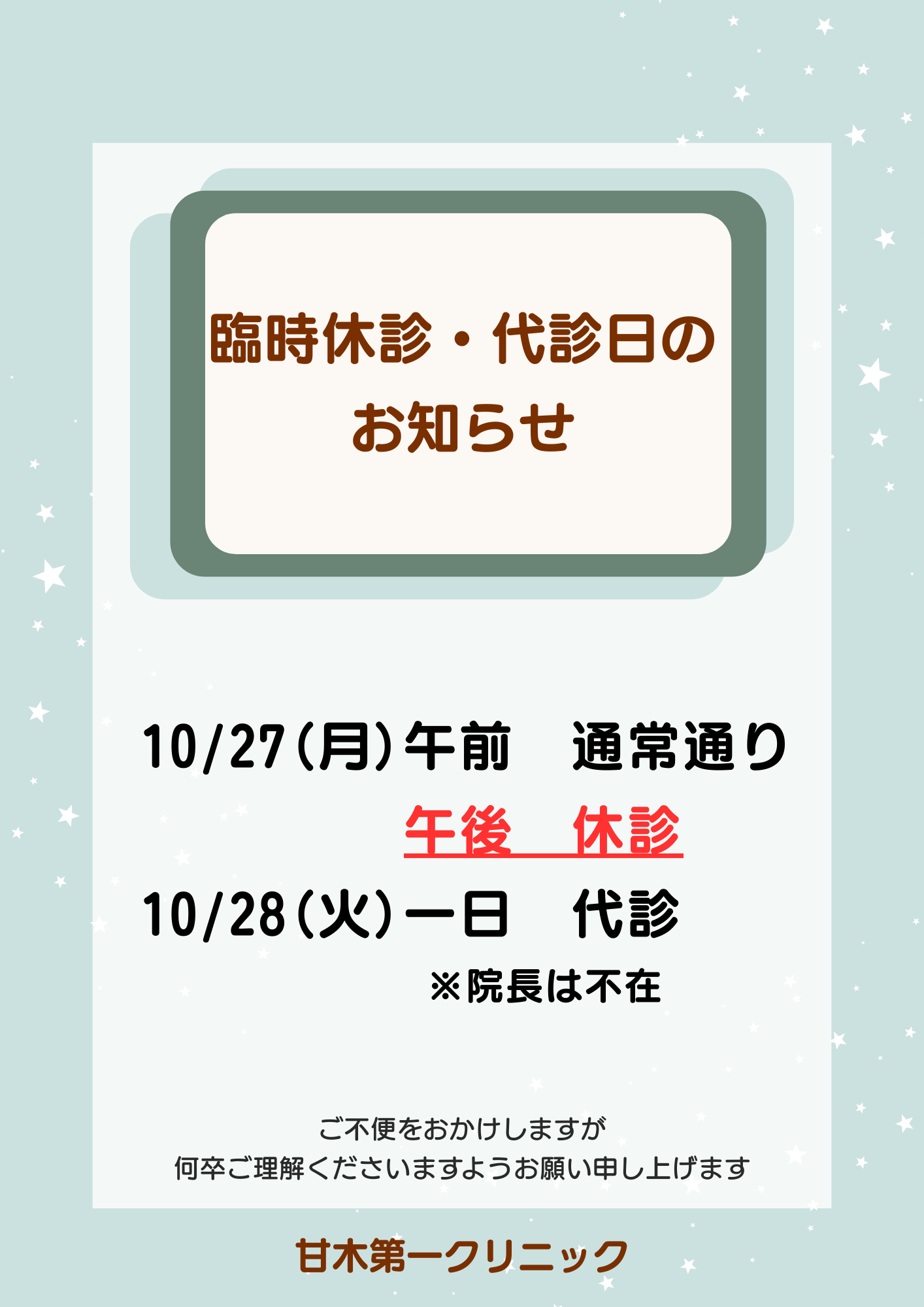 臨時休診・代診のお知らせ 10月27日(月)・28日(火)